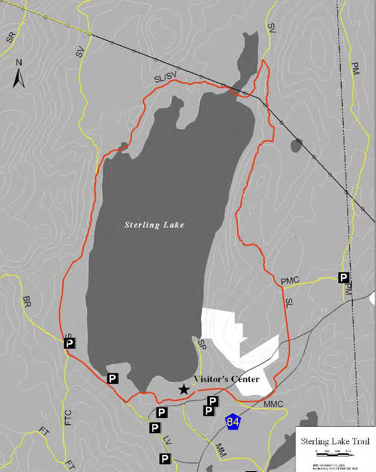 Sterling Valley Loop Trail (5.8 miles) - This loop trail begins along Route 17A at the trailhead/parking area which is also shared by the Sterling Ridge and Allis Trails. There is also a small trailhead located off Ironwood Drive, by the NYU apartments. At the northern end of Sterling Lake, the Sterling Valley Trail is co-aligned with the Sterling Lake Trail. The Pine Meadow Trail terminates at the Sterling Valley Trail along the eastern side of the trail.