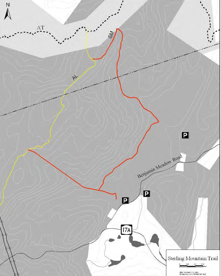 Sterling Mountain Trail (3.3 miles) - As of 2009 this trail was closed and not open to hiking as it was still under construction. The trail begins at the parking area of the old Sterling Gardens on Benjamin Meadow Road. The trail proceeds north crossing a brook at 0.2 mi., the trail then turns right and parallels a marsh area.
