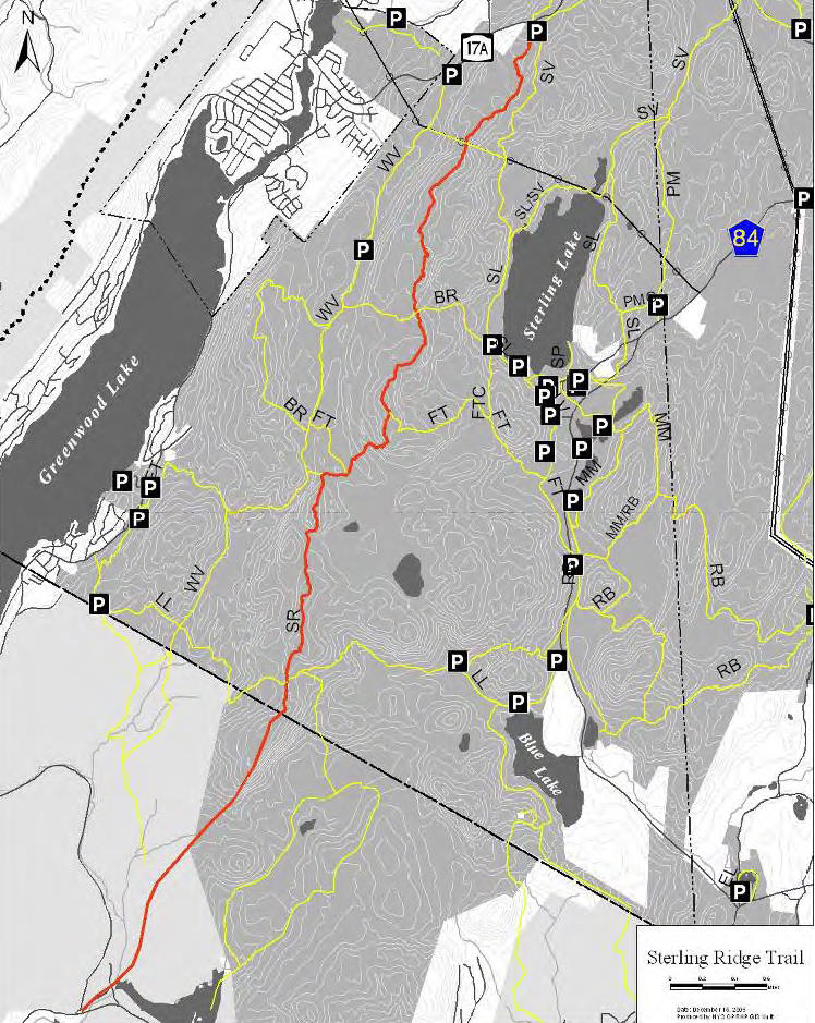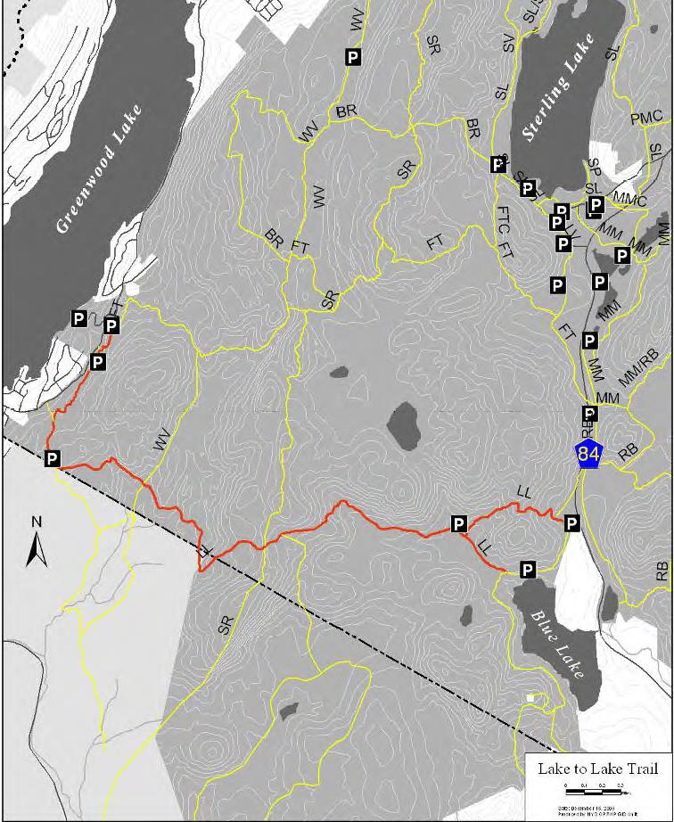 Lake to Lake Trail (4.2 miles) - The Lake to Lake Trail traverses the southern portion of the park. Traveling from west to east, the trail begins near the Village of Greenwood Lake, where the parking area is located along East Shore Drive. The trail generally parallels the New Jersey border with a portion of the trail dipping into New Jersey briefly. The trail crosses the intersection with the West Valley Trail and then crosses the Sterling Ridge Trail. It terminates at Blue Lake, where there is a parking area and portable toilet facility.