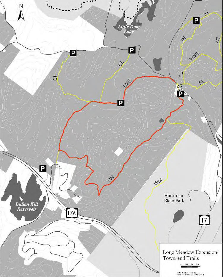 Townsend Trail (1.6 miles) - The trail has access points on Bramertown Road to the north and through Clinton Woods off of NY 17A to the south. The route of this trail generally follows a utility road and a gas line road. Many hikers use this trail and Long Meadow Extension to create a pleasant loop hike.