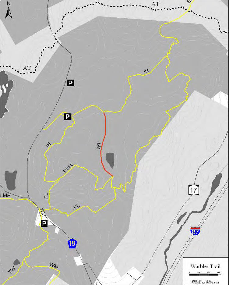 Warbler Trail (0.5 miles) - This trail runs approximately ½ mile in a north-south direction past the former mountain top farm, then narrows to single track foot path which connects to Indian Hill Loop as it passes a 2 ¾ acre farm pond. The pond is visited by fishermen, wildlife enthusiasts and birders. This trail had not officially opened as of 2009.