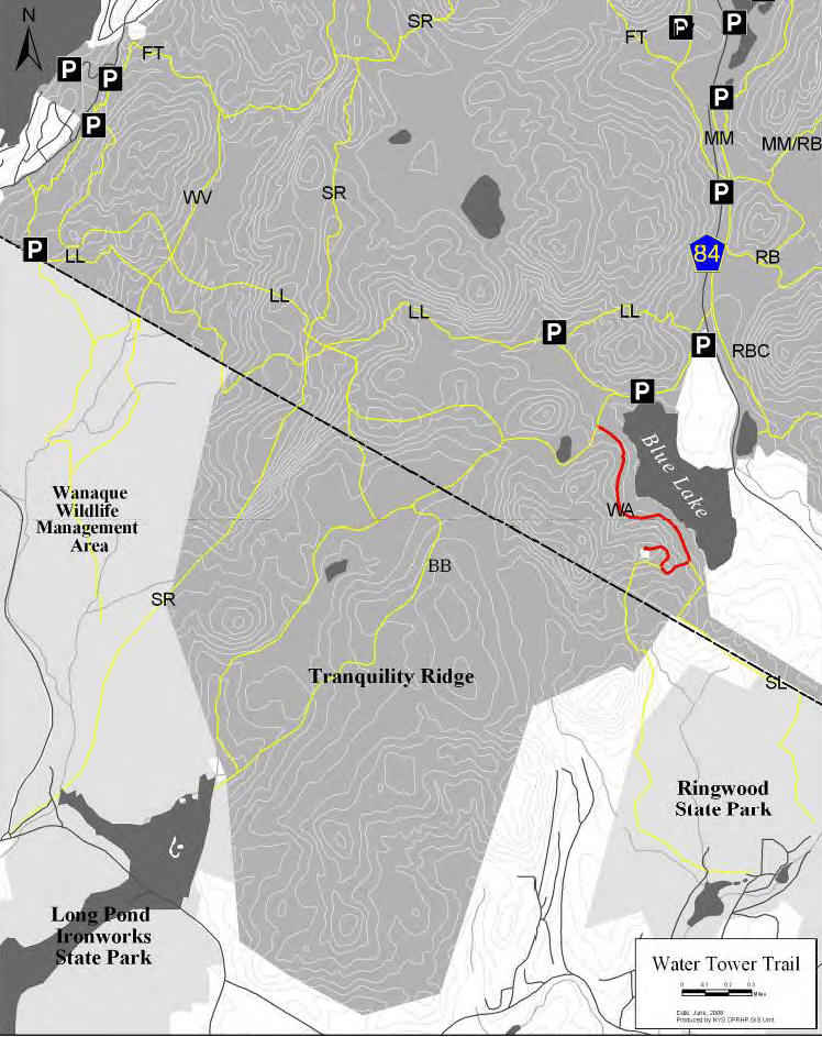 Water Tower Trail (1.0 miles) - This trail follows a gravel road on the southwest side of Blue Lake, which is wide enough for two lanes of traffic at some points. Where it leaves the side of the Lake and climbs the hillside it narrows to a single vehicle width and reverts to rock / gravel and ascends gently to the tower. The trail terminates at a water tower, which is owned by the United Water Company. There are proposals to extend this trail to give access to New Jersey trails.