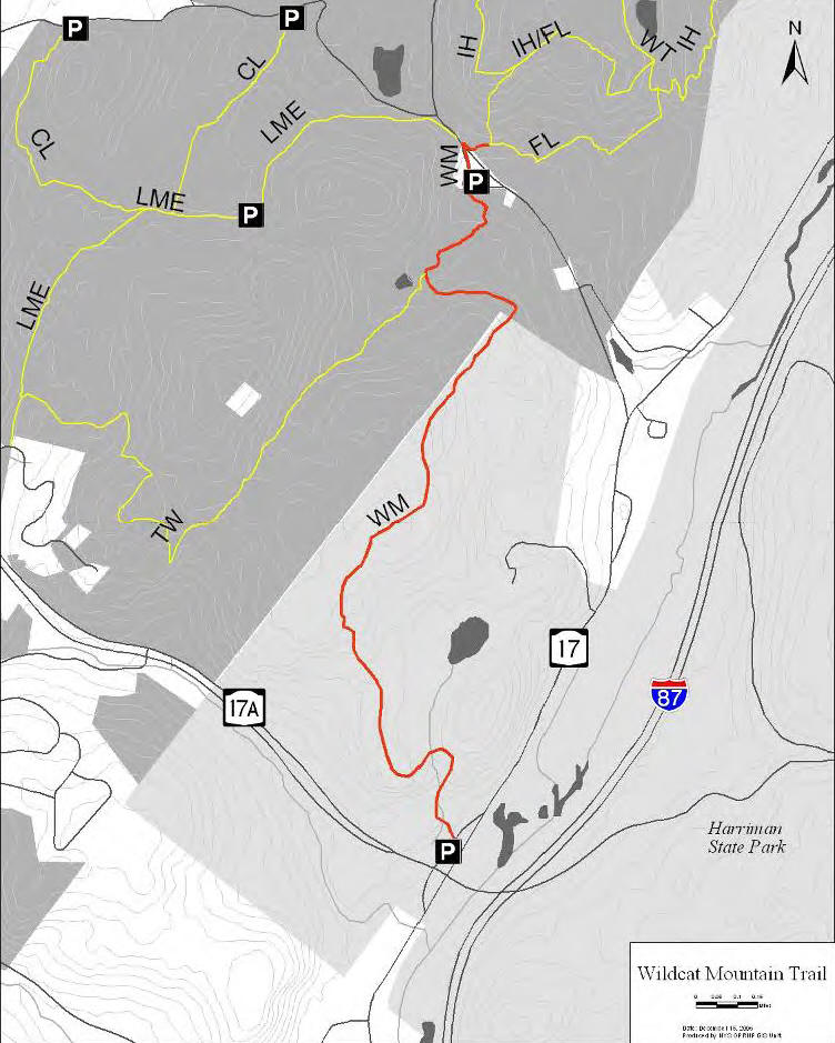 Wildcat Mountain Trail (2.3 miles) - The Wildcat Mountain Trail is located partially in Sterling Forest State Park and mostly in Harriman State Park. The southern trailhead is at the NY 17A Park and Ride on Harriman property. The trail climbs Wildcat Mountain and passes by Spruce Pond. After the trail passes Spruce Pond, it enters Sterling Forest State Park.