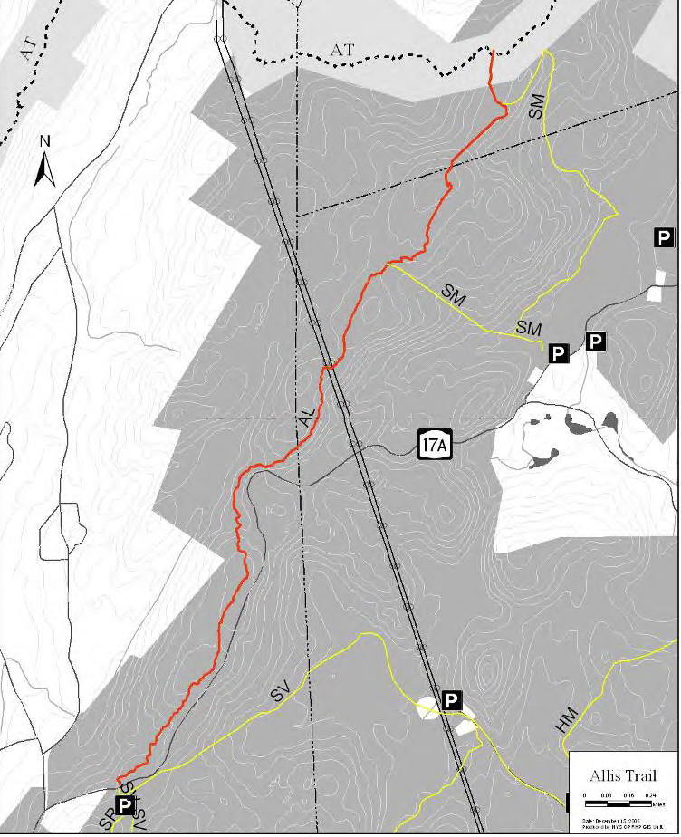 Hikers can then follows the Allis Trail southwest for 0.9 miles and then the trail splits and the Sterling Mountain Trail travels southeast back to the Sterling Gardens area. This half mile section of the trail is highly eroded and can be difficult to walk.