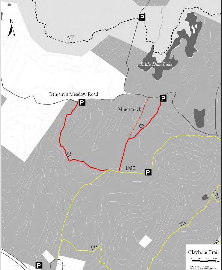 Clayhole Trail (1.9 miles) - This trail runs from Benjamin Meadow Road to the Long Meadow Extension Trail. The trail is very attractive with many ferns, healthy hemlock trees, and interesting rock formations.