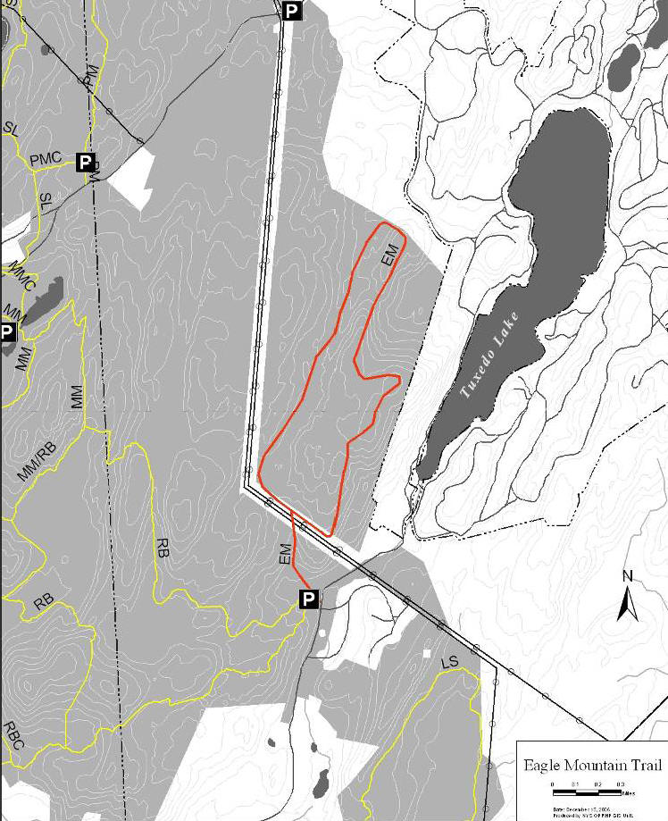 Eagle Mountain Trail (4.6 miles) - This trail was still under construction as of 2009. Access to the trail is from the parking area on South Gate Road. From here it is a short on-road walk north to access the trail which is on the opposite side of a stream that feeds Summit Brook. Heading in a northerly direction, a steep incline with rock outcroppings has to be negotiated in order to reach a wooded plateau beyond which is a power line corridor at 0.5 miles.