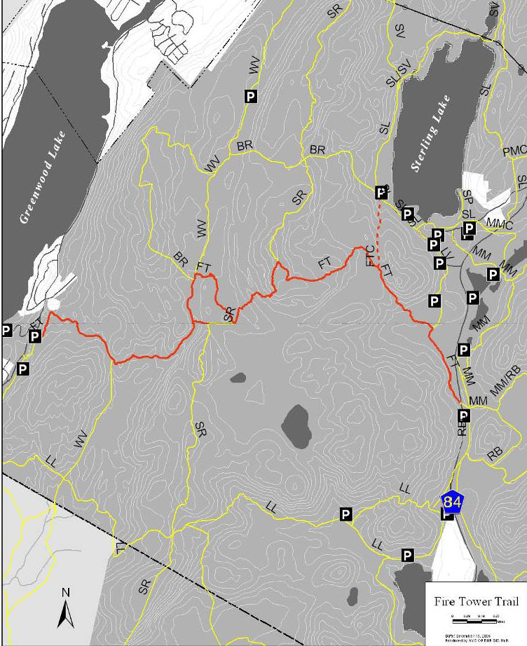 Fire Tower Trail (4.9 miles) - From the seasonal hunting parking lot located off of County Route 84, the trail travels northwest and ascends to the fire tower. This portion of the trail supports vehicle traffic and was used by the fire tower ranger. There are several steep grades and a section of the trail is severely eroded.