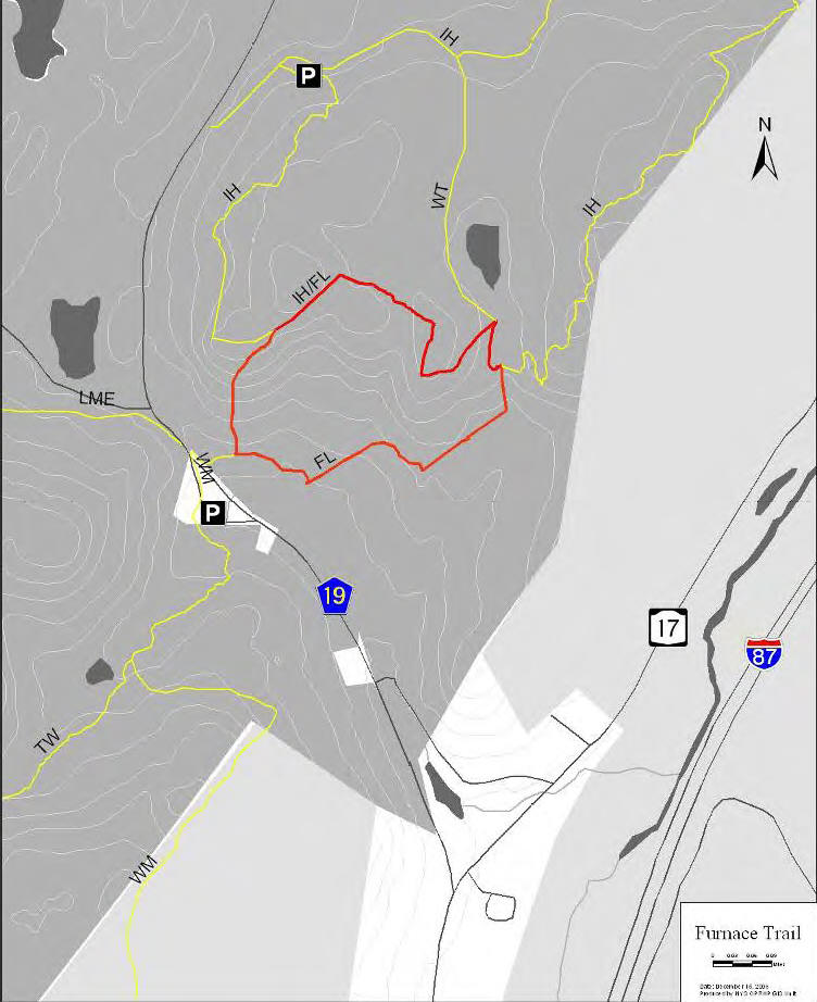 A portion of the trail in Sterling Forest State Park coincides with the Townsend Trail. The trail ends at Bramertown Road across the road from the trailhead to the Furnace Loop. There is limited parking at the northern trailhead.