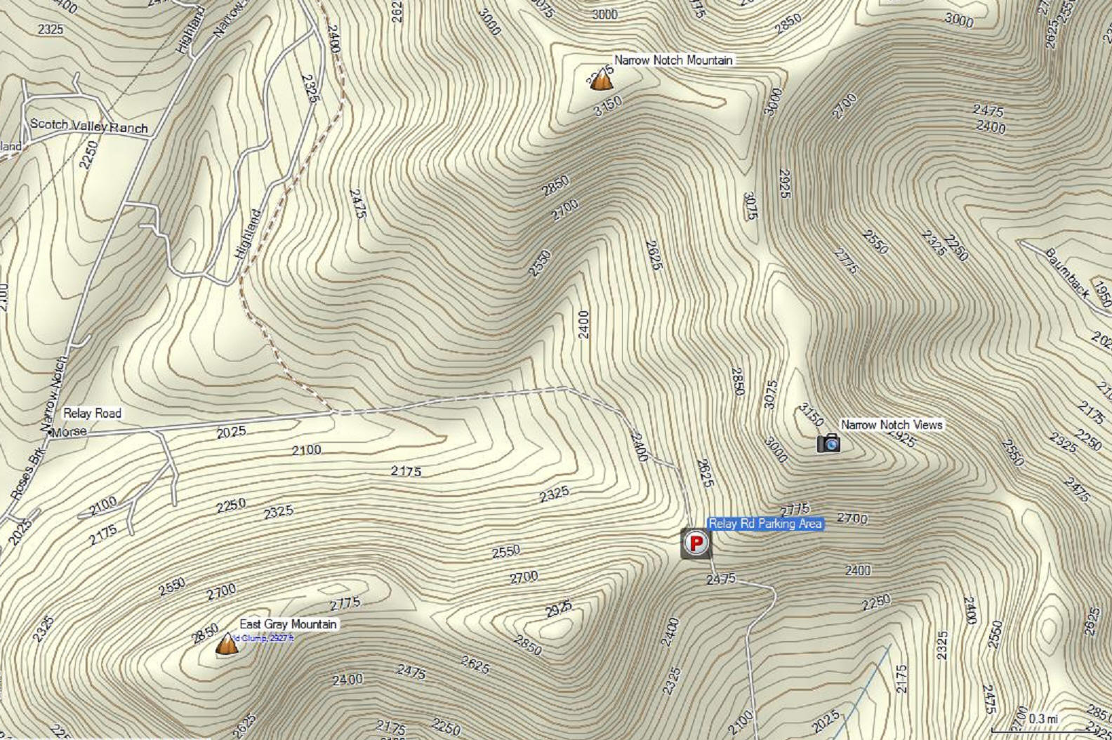 To get more detailed info on the route to Narrow Notch Mountain and other Catskill 67 hikes, we recommend purchasing the hiking guide The Catskill 67. The book gives more info on the route to this mountain. Look below for a topographic map of Narrow Notch Mountain to help assist in planning your hiking adventure.