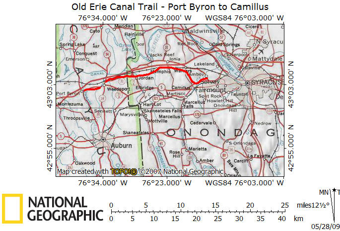 A twenty eight mile completed section of the Canal Trail runs from Schasel Park in Port Byron to NY 173 near Camillus, NY. Highlights include the old Centreport Aqueduct near Weedsport, Lock 51 near Jordan, as well as Erie Canal Park in Camillus. The Erie Canal Aqueduct over Nile Mile Creek was rebuilt to give visitors a chance to see what the old aqueducts looked like back in the 1800's.