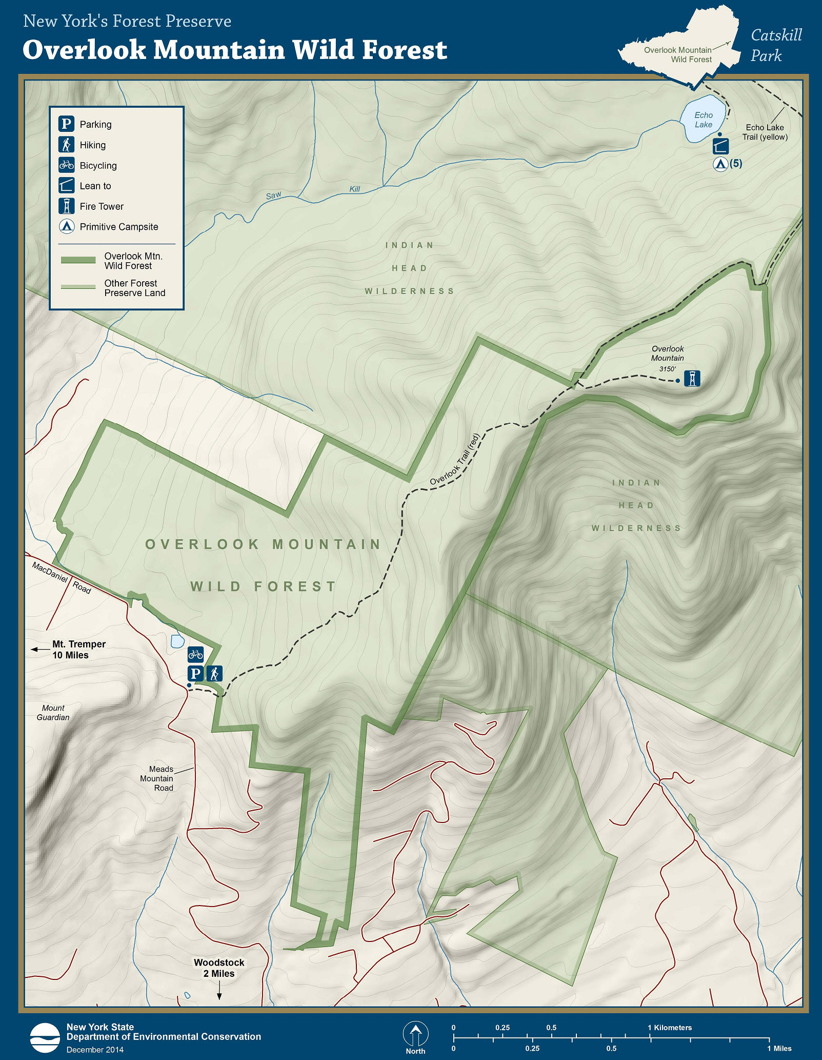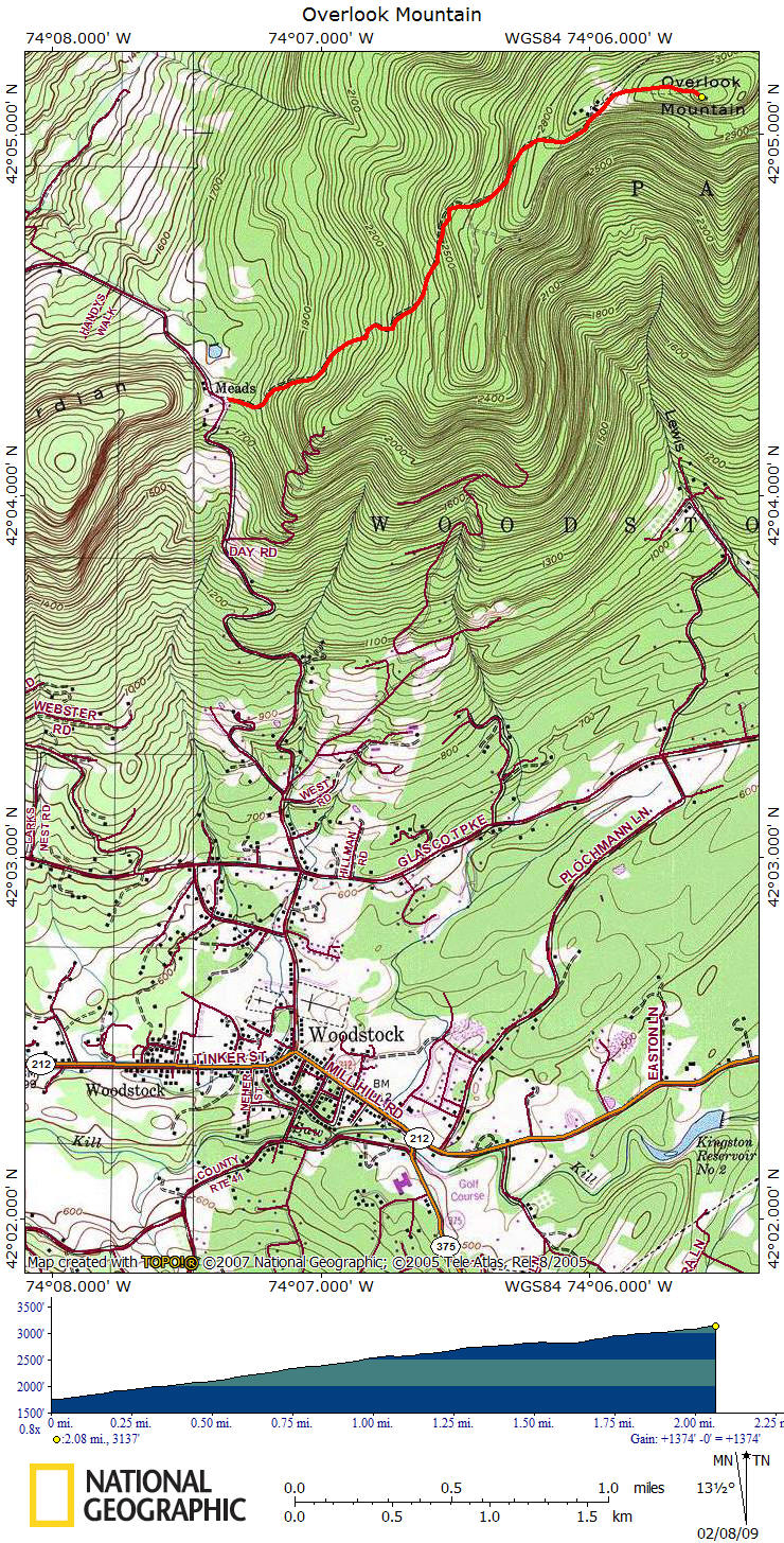 (Red-blazed Overlook Spur Trail)The Overlook Mountain Fire Tower can be reached from two different directions. The most popular route (shown below) begins at the trailhead of the red-blazed Overlook Spur Trail along Meads Mountain Road, about 2 miles outside of the village of Woodstock. This 2.4-mile-long trail ends at the summit of Overlook Mountain. after hiking 1.6 miles, you will pass by the ruins of the Overlook Mountain House.
