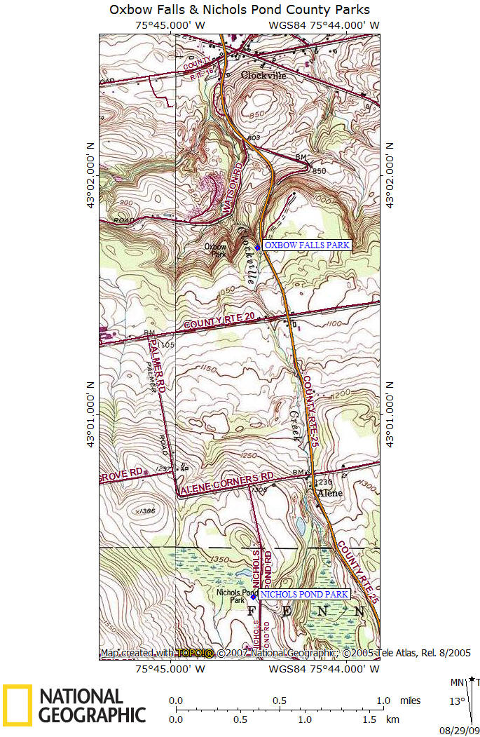 Enjoy a game of softball, have a picnic, or take a hike to one of the scenic views offered by the unique setting of Oxbow Falls County Park. This county park has 125 acres of woods, streams, fields, waterfalls, picnic tables, grills, pavilions and scenic views. The park is located in Madison County, south of Canastota, NY just off Oxbow Road. The main waterfall is 100 feet.