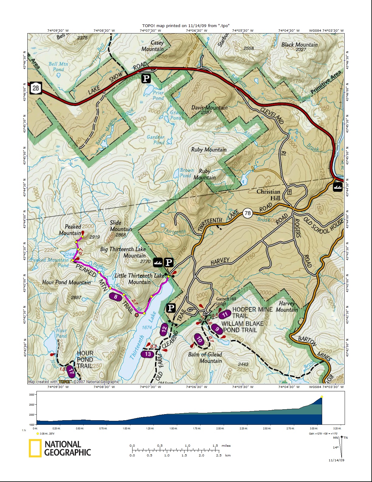 Peaked Mountain, elevation 2919 feet, is a modest sized mountain located north-west of Thirteenth Lake. It is a very steep sided summit, which gives great views of the surrounding forest, lakes, and mountains, including the high peaks. The trailhead is at the parking lot for public access to Thirteenth Lake. The lot is reached by taking Thirteenth Lake road off of NY 28 north of North Creek.