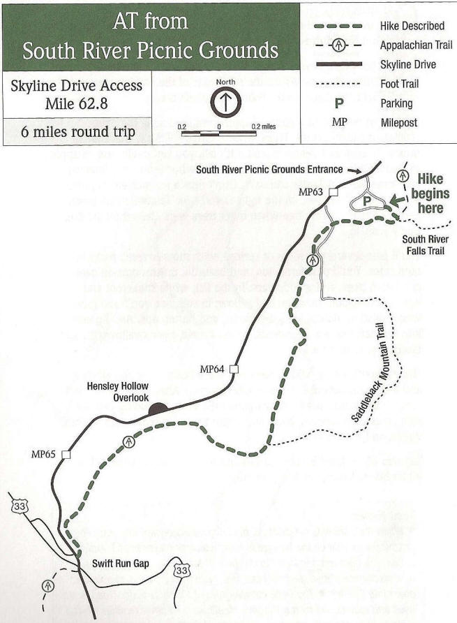 This round trip hike of six miles features a scenic section of the Appalachian Trail that is a huge favorite of some hikers. We've read that some hikers do this stretch again and again. If six miles seems to far for you, then just hike a mile or so before turning back. Some stop just prior to the AT descending steeply into Swift Gap or park two vehicles, one at South River Picnic Grounds and the other at Swift Gap.