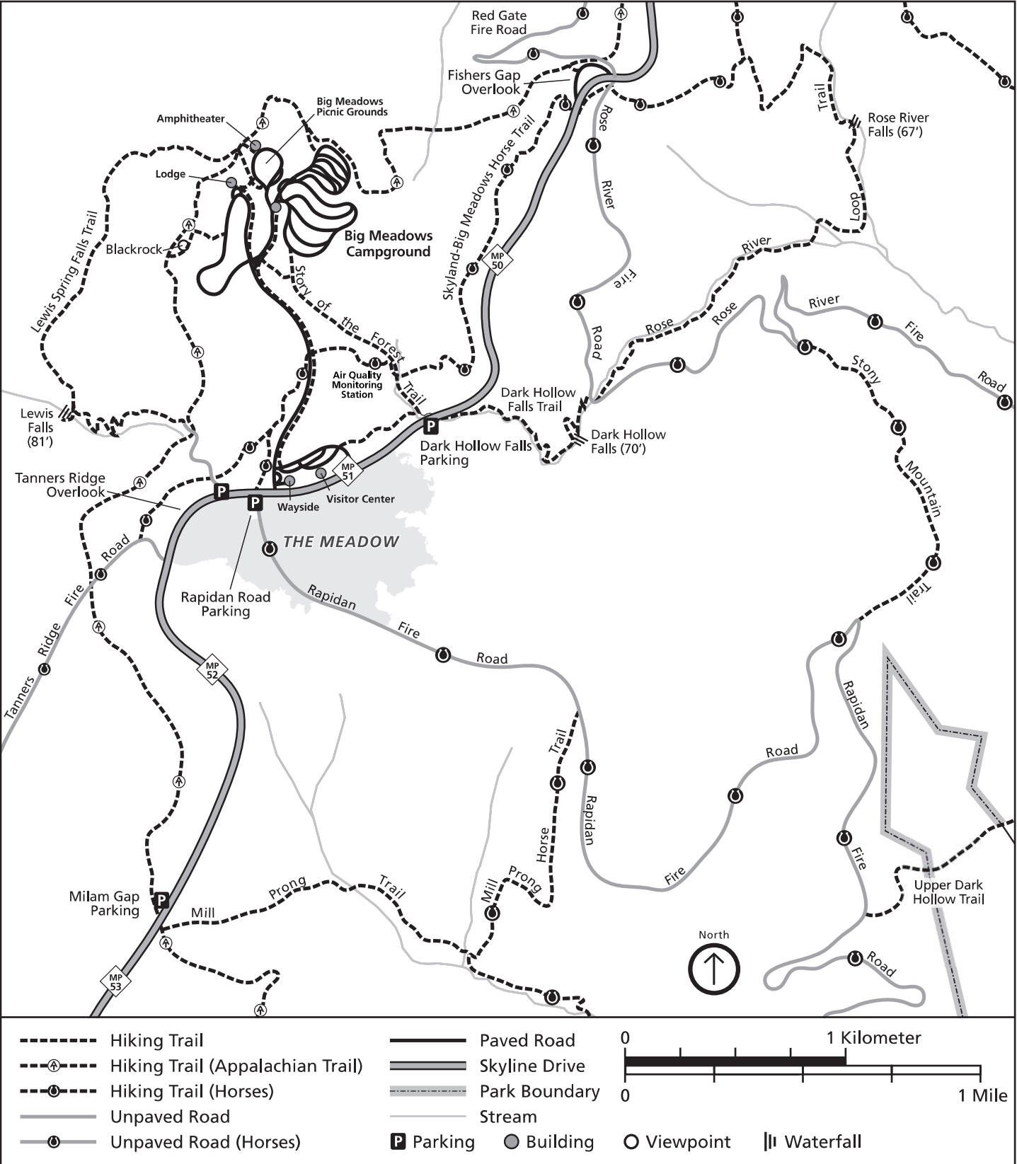 From Skyline Drive turn off at milepost 51.2 at the wayside for Big Meadows. Drive 0.9 miles on the access road to Big Meadows Lodge. Park at the far end of the parking area. There is a sign near the start of the trail. Bring a flashlight and watch the sun set, then look for the lights down in the valley below. We recommend purchasing Shenandoah National Park (National Geographic Trails Illustrated Map)