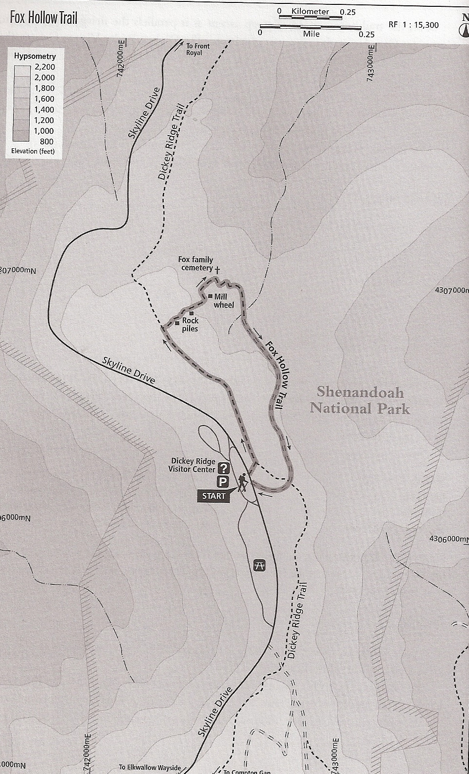 From the visitor center parking area, cross Skyline Drive and turn left on the Dickey Ridge Trail at the cement post. After 0.2 miles along the Dickey Ridge Trail, turn right onto the Fox Hollow Trail at the cement post. Now your walking on the ground where Thomas and Martha Fox started farming in 1856.