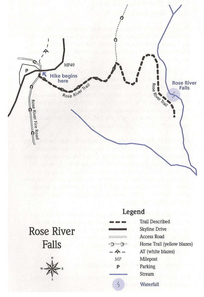 Park at the Fishers Gap Overlook located at milepost 49.4 along Skyline Drive. Be sure you park at the overlook and not at the fire road next to the overlook. From the overlook, cross Skyline Drive (watch for vehicles at this blind curve) and walk down the Rose River Fire Road for about 200 feet to a trail post. Turn left here onto the Rose River Trail. The first part of this trail is also a horse trail. At 0.5 miles stay straight as the horse trail turns left. The trail is still wide but gets a bit steeper. At about 1.0 miles you come to another trail post stating that the falls are 0.3 miles away.