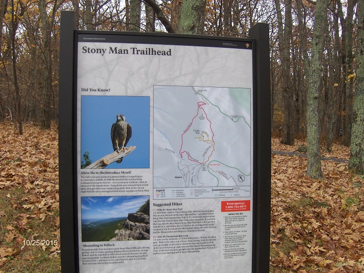 The start of this hike features the white blazed Appalachian Trail. At 0.4 miles the Appalachian Trail turns right. Stay straight ahead on the blue blazed Stony Man Trail. Soon you'll reach a Y junction. Veer right here as the other fork will be your return trip. At the horse hitching rail turn right to reach the rocks and the view. You are standing on the parks second highest peak at 4010 feet. Please note there are no pets allowed on this hike.