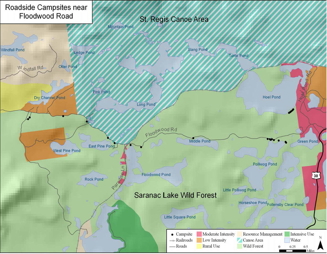 For those looking for a more primitive camping experience can try the roadside campsites along the dirt Floodwood Road. These camp sites are available for free on a first come basis, however those planning to stay for more than three days will need to receive a permit from the NY DEC. See the map below.