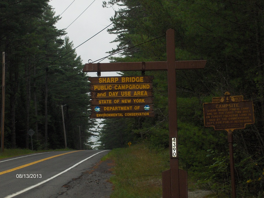 Sharp Bridge State Campground is located along the Schroon River off US 9 near North Hudson. There are forty campsites available and this campground is popular for those planning day hikes into the High Peaks Region of the Adirondacks. From I-87 exit 29 it is located 8 miles north on US 9 and from exit 30 it is three miles south on US 9. The GPS coordinates of the entrance to the campground is N44 02.625 W73 40.647.