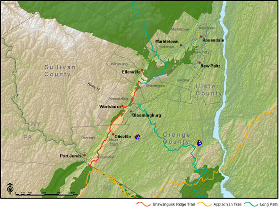 The Shawangunk Ridge Trail heads north from the Appalachian Trail, passing through High Point State Park and then generally follows the ridge north, occasionally using abandoned roads and rail beds. Beyond the Village of Otisville, the trail descends to the Basha Kill Wildlife Management Area. The Basha Kill is an extensive wetland offering many opportunities for bird watching and other wildlife viewing. North of the Basha Kill, the Shawangunk Ridge Trail passes through the Village of Wurtsboro and then ascends the Wurtsboro Ridge.