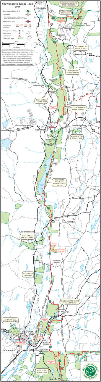 The Shawangunk Ridge Trail provides a hiking opportunity that runs for 35-miles along the length of the ridge from High Point to Minnewaska. At High Point, it joins the world's longest linear park and greenway, the 2150-mile Appalachian Trail, which runs from Springer Mountain, Georgia to Mount Katadin in Maine.