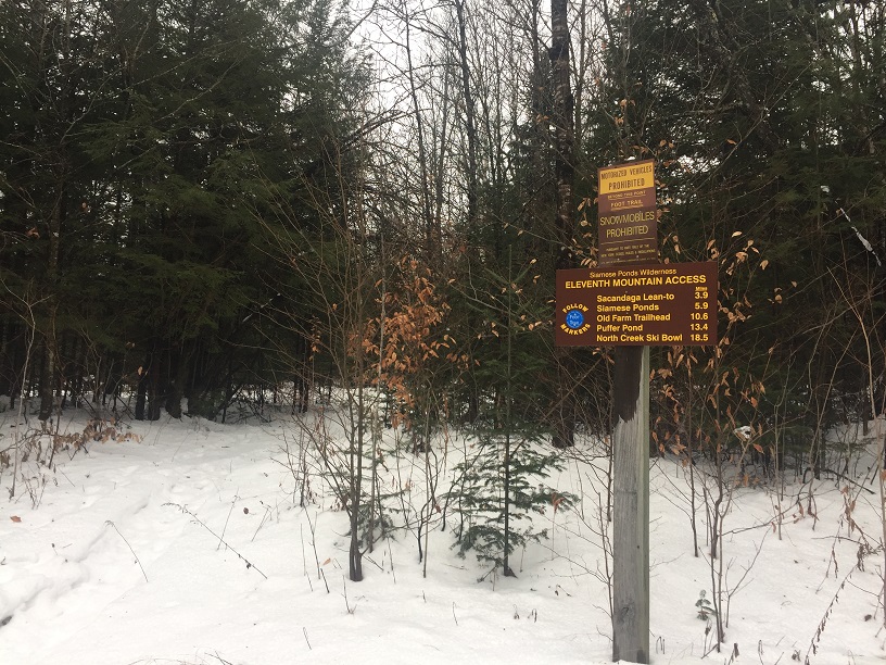 Start of the trail and DEC sign at the Eleventh Mountain Trailhead