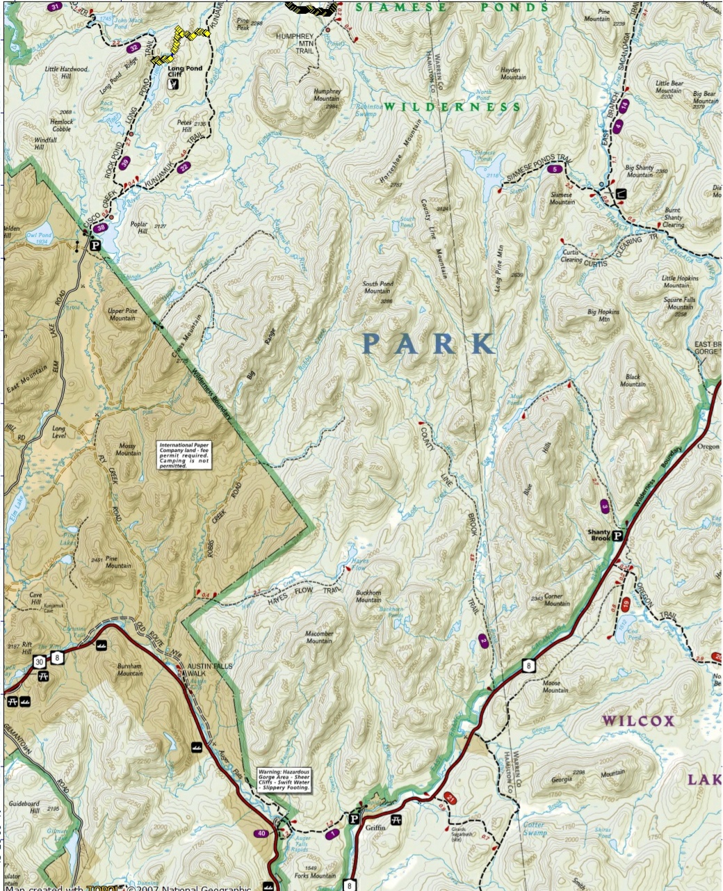 Siamese Ponds Auger Falls Peaked Mountain Chimney Mountain Griffin Gorge Auger Falls Road Macomber Creek Extract Brook County Line Falls County Line Brook Buckhorn Mountain Corner Mountain Shanty Brook Falls Shanty Cliffs Mud Ponds Black Mountain Fox Lair East Branch Gorge Cook Brook Square Falls Curtis Clearing Eleventh Mountain Bog Meadow Second Pond Diamond Brook Macomber Mountain Rock Pond-Long Pond Long Pond Cliffs Hayes Flow Big Range Shingle Brook Valley John Mack Pond Crotched Pond Center Pond Clear Pond John Pond John Pond Ridge Round Pond Lambda Falls Hour Pond Puffer Pond Kings Flow Puffer Mountain Cliffs Humphrey Mountain Ruby Mountain Prier Pond The Hooper Mine William Blake Pond Balm of Gilead Mountain Elizabeth Point Twin Ponds Buck Meadow Flow Botheration Pond East Branch Sacandaga River