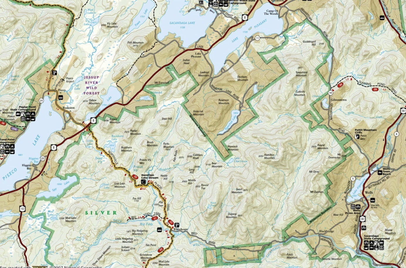 Silver Lake Mud Lake Hamilton Lake Stream Big Eddy Trail West Branch Path Vly Creek Falls Blackbridge Path Finch Mountain Jimmy Creek Falls Falls on West Branch Sacandaga West Branch Gorge Upper Stoner Lake Brown Lake Hidden Vly North Branch Reservoir Silver Lake Outlet Chub Lake Sherman Mtn Cliffs Trout Lake Mtn Cliffs Trout Lake Piseco Outlet/West Branch Confluence Rogers Mountain Duck Lake Three Ponds Mtn & Helldevil Dam The Notch Woods Lake Little Cathead Mountain Groff Creek Rock Lake Southerland Mountain