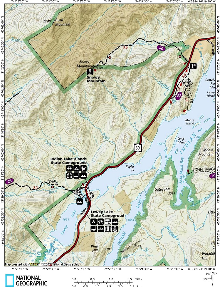 The trailhead for Snowy Mountain is on NY 30 south of the town of Indian Lake, just to the north of Lewey Lake State Campground. It is a hike of about 3.8 miles one way with an elevation gain of over 2000 feet. The first about 2.4 miles is a pleasant walk in the woods along a stream. You cross the stream several times while climbing 600+ feet in the process. The stream crossings on this trail should give hikers no problems in the dry parts of summer and the fall, and it is no problem during the frozen part of winter, but it could be a problem during the snowmelt runoff of spring.