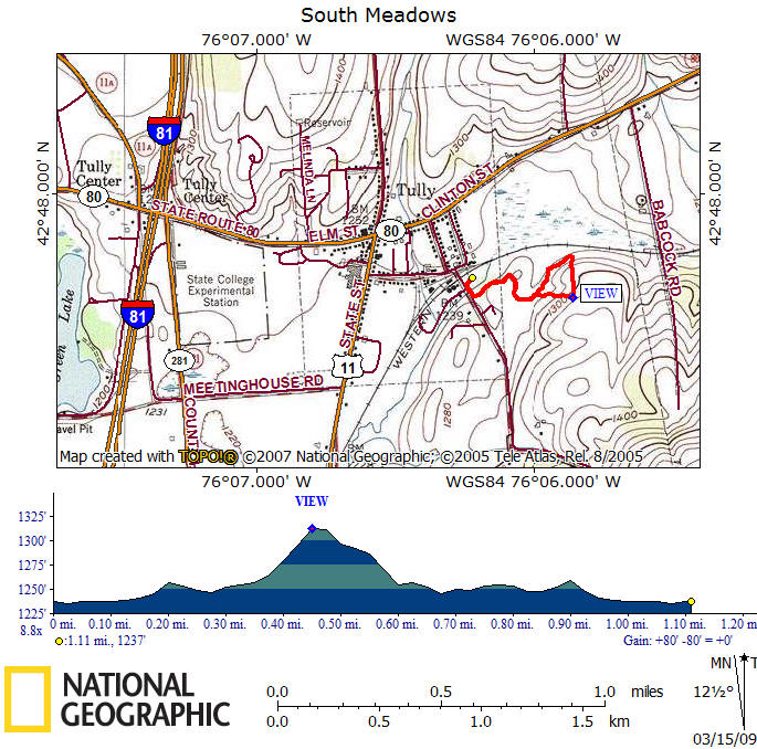 To get to South Meadows from NY 80, turn south on US 11 at the traffic signal in the Village of Tully, proceed one block and turn left onto Onondaga Street; continue toward the end of Onondaga Street. Turn right onto Grove Street and over the railroad tracks. Park in the Cummings Park parking lot on your left. Walk up Grove Street over the stream and the trail head will be on your left.