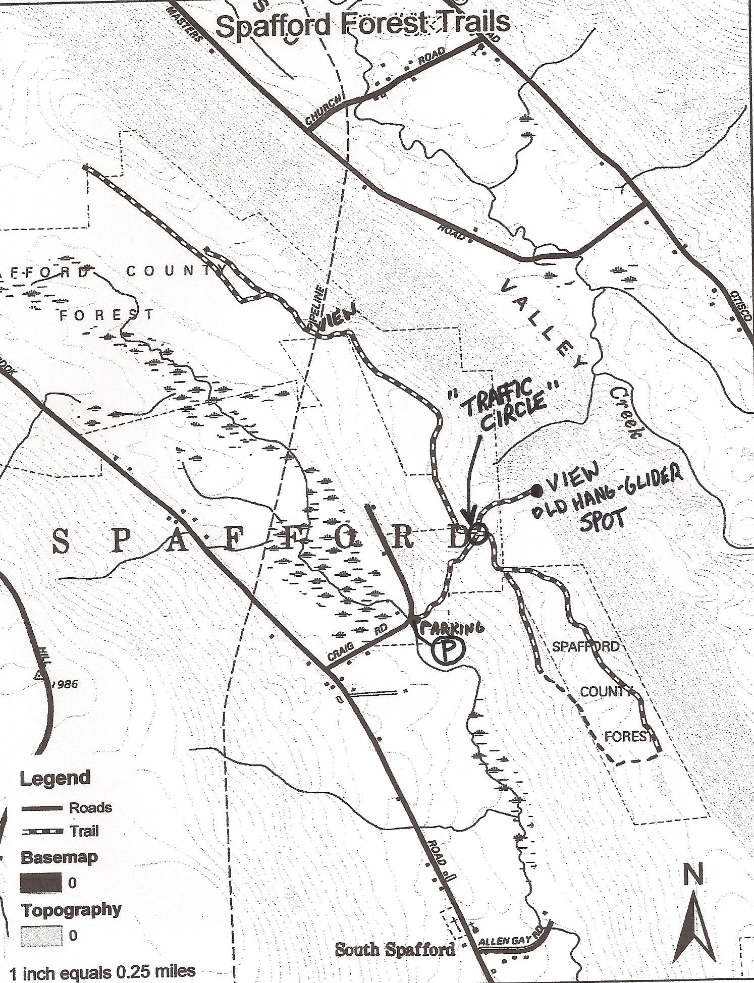 There is a map below that has some of the jeep trails listed. You can easily create your own hiking adventure. I have also included a map to hike to the hang glider view. It is a 0.5 mile walk to the hang glider spot with an elevation change of 100 feet. The start of the hike is somewhat steep. The trails can be muddy from all the 4x4 action. The "traffic circle" is where four jeep trails meet around a tree. This is a great place to practice your mapping and gps skills. Moon Hill Forest (Burke Parcel) is close by.