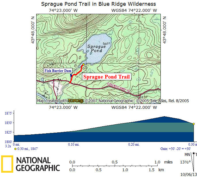 The short 0.3 mile hiking trail to Sprague Pond is located in the Blue Ridge Wilderness, which is located in the Central Adirondacks, southwest of the hamlet of Indian Lake off NY 28/30 on Cedar River Road. This short 0.3 mile hike to Sprague Pond is a great short, easy hike to a beautiful, scenic pond. Don't miss taking this short hike if your in the Indian Lake area of the Adirondacks. This is a popular fishing spot.