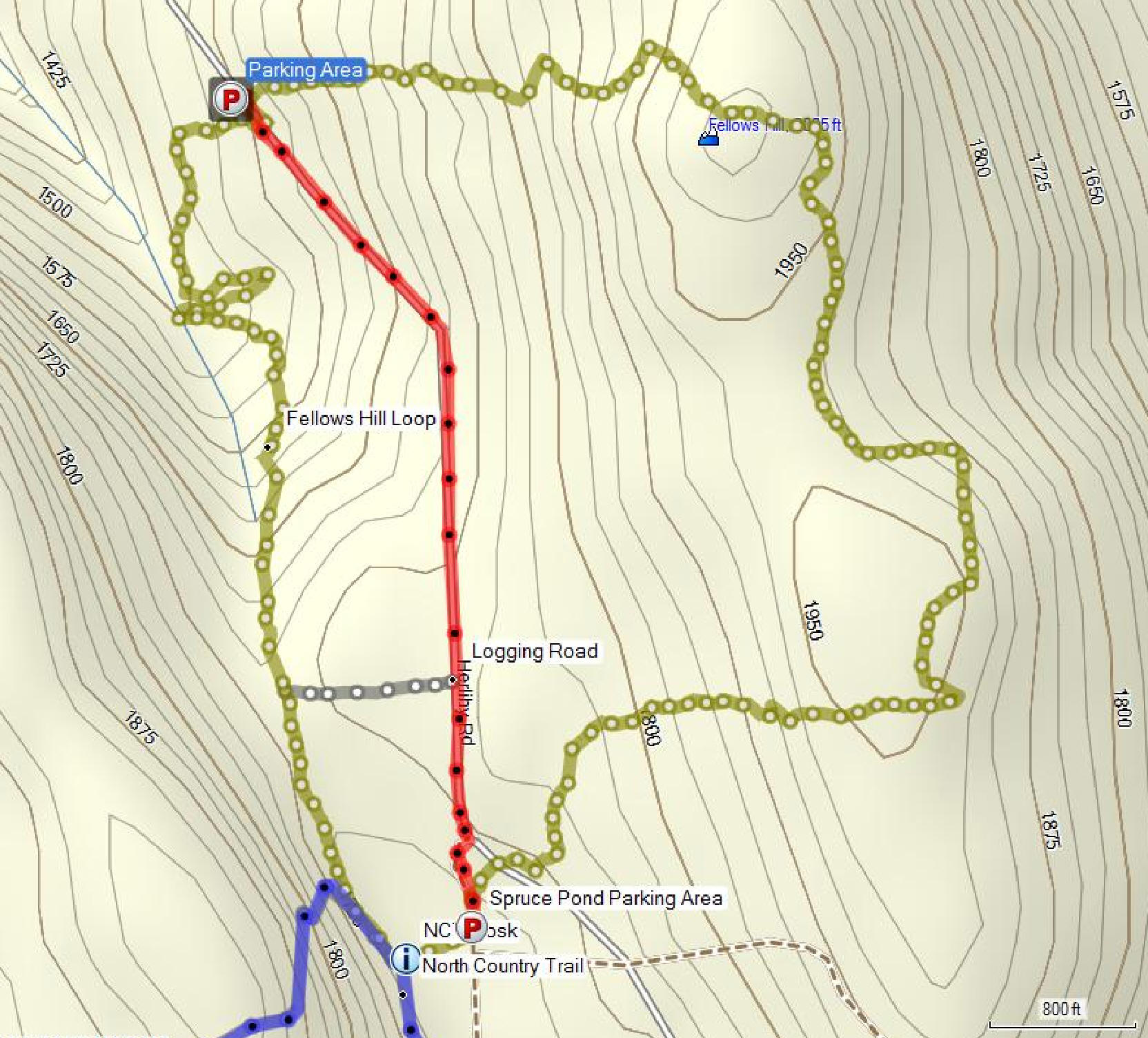 The walk along the dirt road is pleasant. As you get closer to Spruce Pond you'll pass an old logging road on your right that has a few boulders to keep vehicles out. This logging road leads to the Fellows Hill Loop Trail at a clearing that was a logging staging area in 2010. After the logging road you'll soon start seeing primitive campsites on the right, especially as you get closer to the pond. The main dirt road veers left, where you'll go straight to reach Spruce Pond.