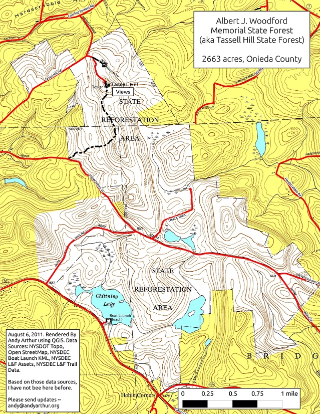 The 2663 acre Tassel Hill State Forest is now known as the Albert J. Woodford Memorial State Forest, located in the southern part of Oneida County. The state forest features the highest point in Oneida County at 1945 feet, Tassel Hill. A popular destination in the state forest is Chittning Pond fishing pier and picnic area, located just of US 20, four miles west of Bridgewater and four miles east of Waterville.