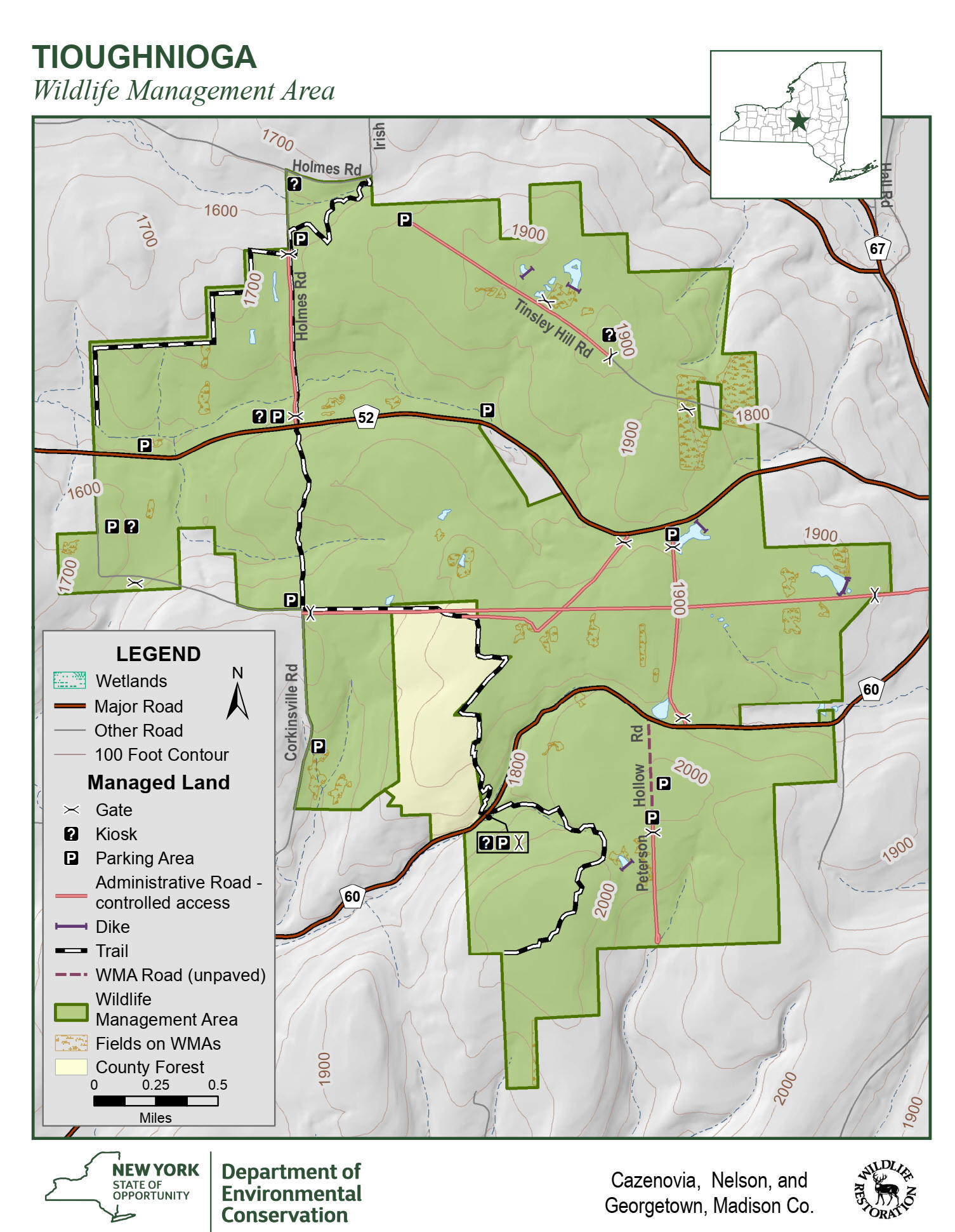 The 3737 acre Tioughnioga Wildlife Management Area is very popular for hunting, however there are a few hiking trails that travel through the WMA including the North Country National Scenic Trail as well as the Link Trail (see map below). It's suggested that you don't hike in the WMA during big game hunting season.