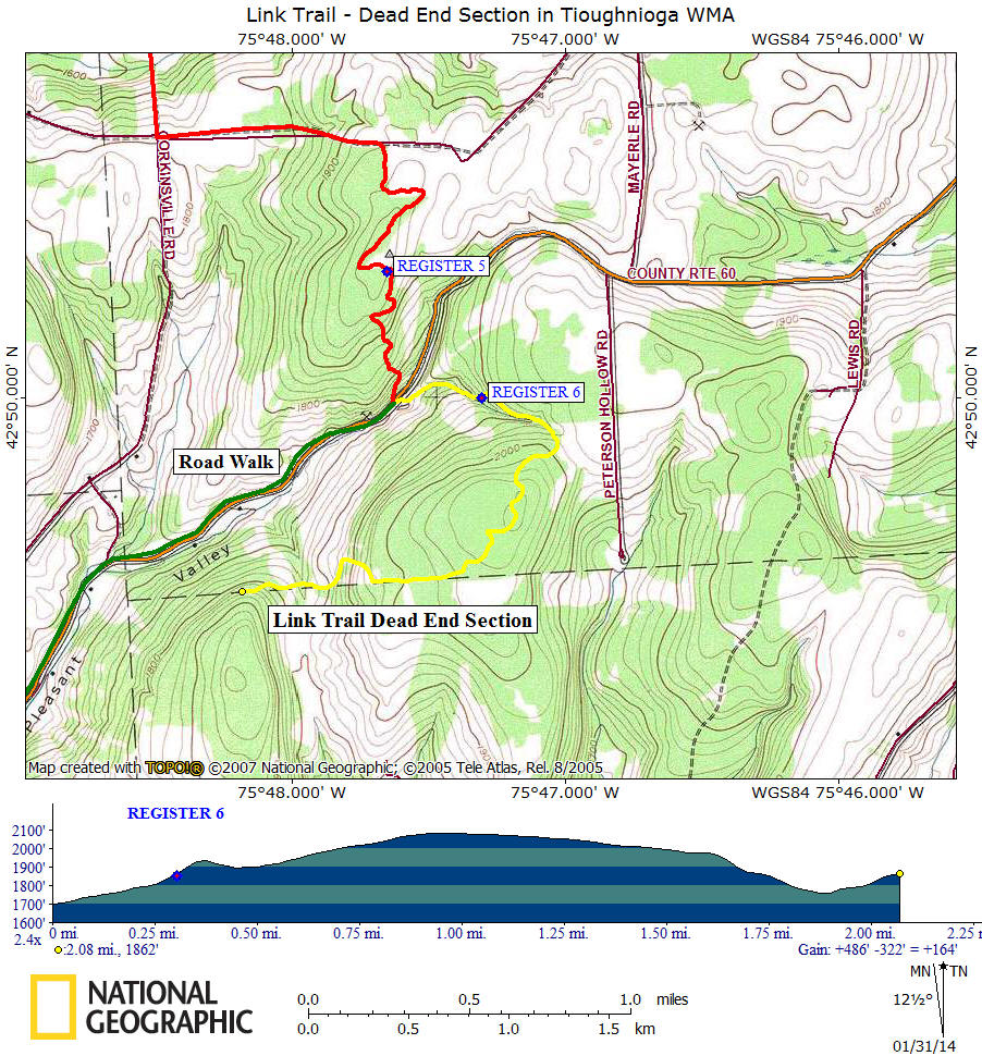This 2.1 mile section of the Link Trail comes to a dead end soon after leaving Tioughnioa WMA due to the loss of permission for the trail on a new land owner’s property. The loss of this 0.8 mile section of the Link Trail has created a gap in the trail as well as a 4.6 mile road walk.