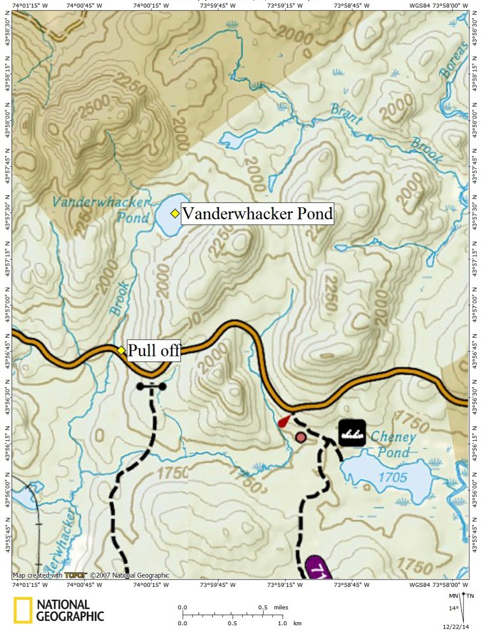 It is 0.75 miles of hiking before you reach the pond. This hike has an elevation gain of nearly 200 feet from the pull off to the pond. There is no discernable path around the pond. Since this hike follows an unmarked path, you should look at this hike as a bushwhack. Be sure to be properly prepared with the correct hiking supplies. As long as you stay near Vanderwhacker Brook, you shouldn't get lost. The brook runs from the pond to Boreas Road.