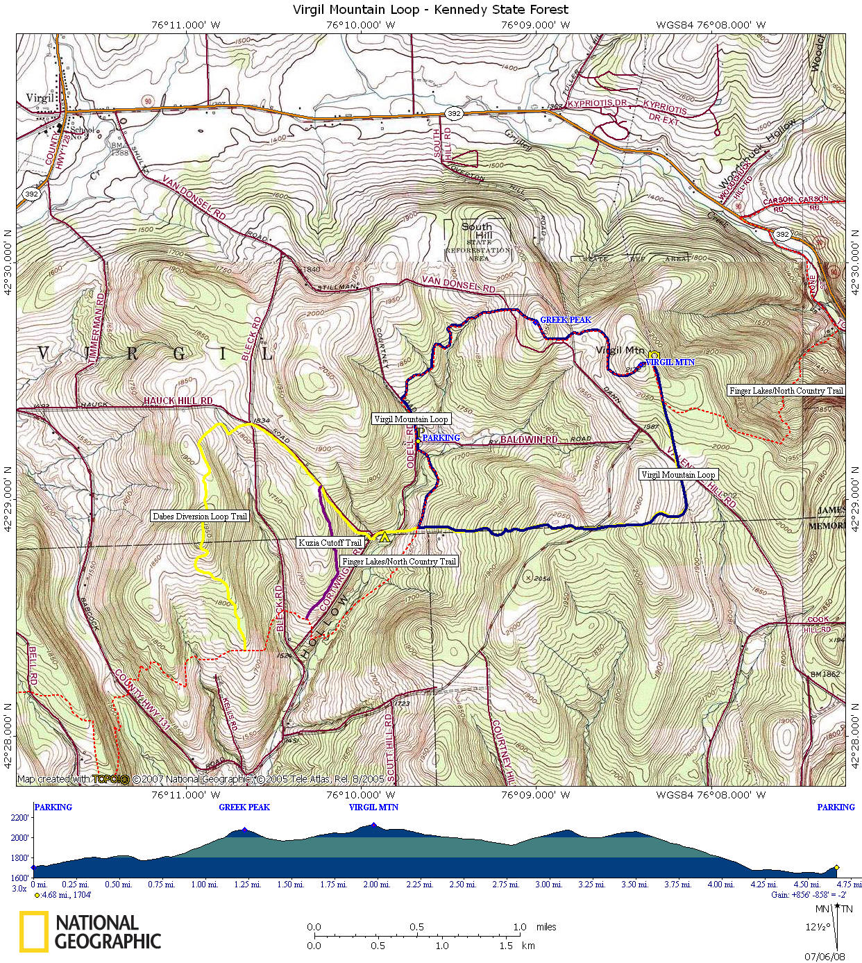 This 4.7 mile loop hike takes you past the Greek Peak Ski resort and to the highest point in Cortland County on Virgil Mountain (2132 feet). There are also some views along the way. This is one of the more popular loop hikes in Central New York. The creek crossing just south of the parking area can be tricky/dangerous in high water times.
