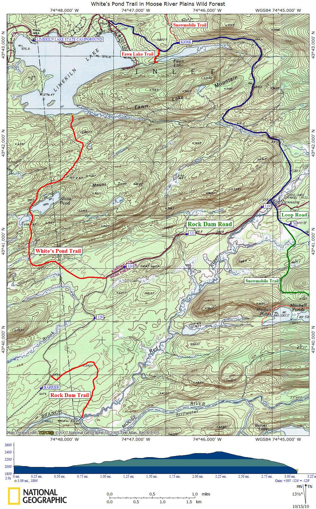 The White's Pond Trail is little used and sometimes overgrown, however it's worth exploring the trail to White Pond. The marked trailhead is located off Rock Dam Road, 2.6 miles from Moose River Plains Road. The trail is well marked with yellow DEC discs. The trail travels 1.6 miles to White Pond and then on to the southern shores of Limkiln Lake after 3.1 miles.