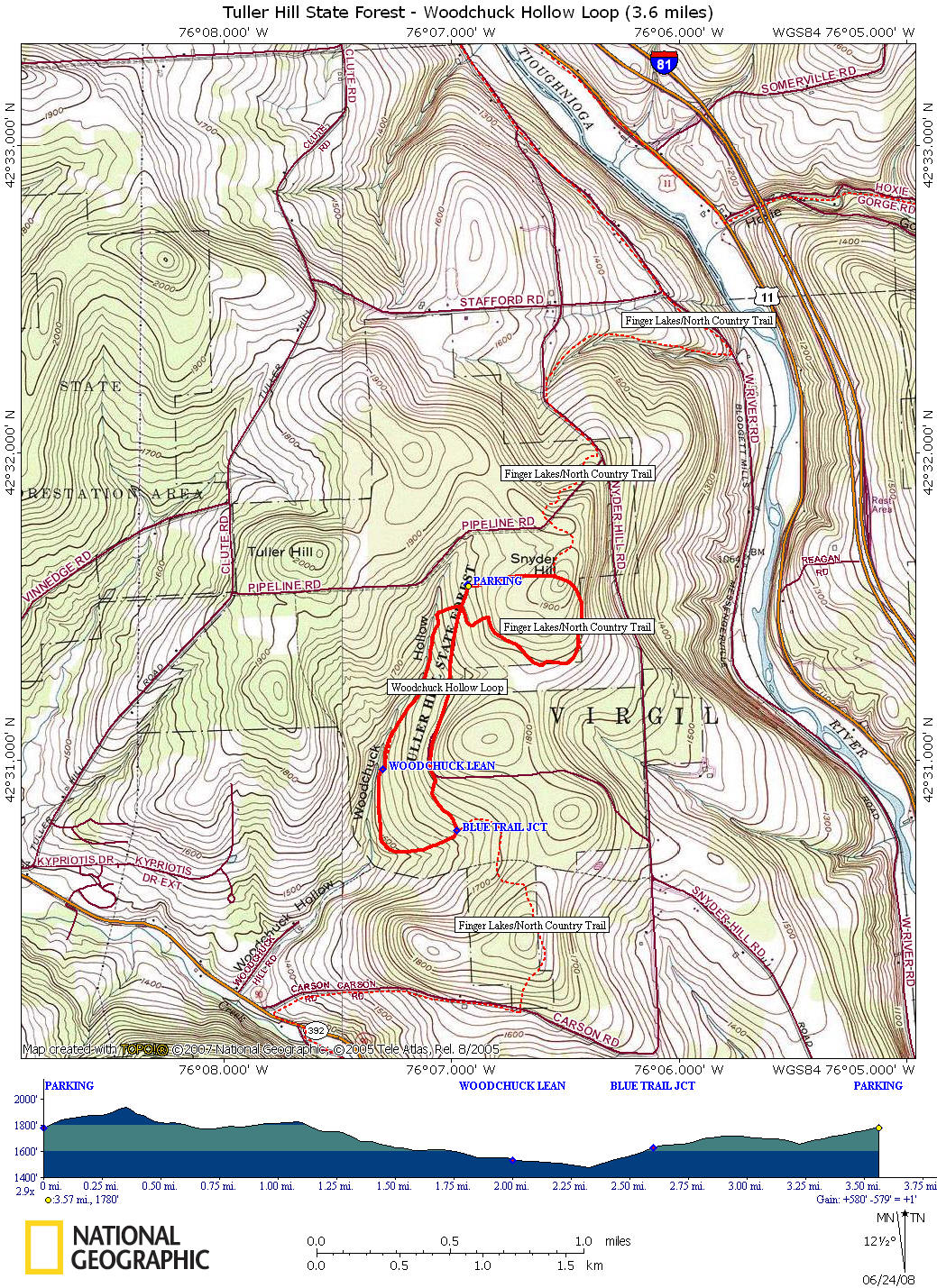 This 3.6 mile hike in Tuller Hill State Forest utilizes part of an old truck trail, the Finger Lakes Trail / North Country Trail, a blue blazed access trail and a seasonal dirt road to create a figure eight loop. This hike features Snyder Hill, the scenic Woodchuck Hollow and Woodchuck Hollow lean-to.